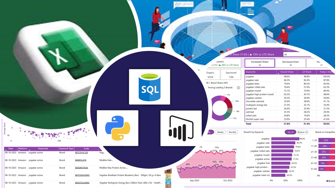 Automated solution to analyze Yogabar's keyword performance on Amazon and Flipkart using Python, SQL, and Power BI. Delivers insights on brand visibility, competition, and product placement.